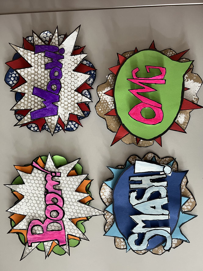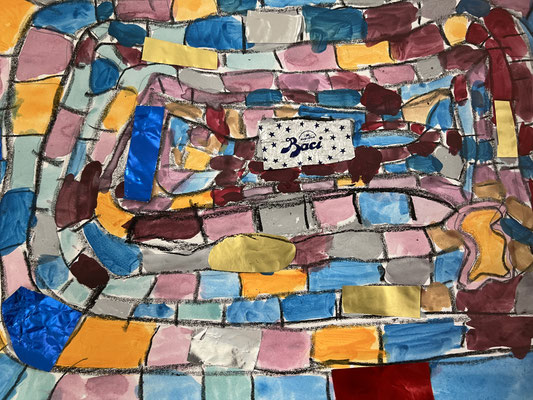 Eine Burg ist eine Befestigungsanlage oder ein bewohnbarer Wehrbau. Wie eine Verteidigungsanlage sehen diese bunten Bauwerke aber nicht aus. Hier wohnen bestimmt Prinzen, Prinzessinnen, Ritter, fröhliche Kinder, Eltern, die alles erlauben. Mancher wird vielleicht auch Drachen, Süßigkeiten und Luftballons auf diesen tollen Bildern entdecken und möchte diese Burgen einnehmen. Erstellt wurden die Kunstwerke von der 3b im Schuljahr 2021/2022. Es wurden große Flächen unterteilt, in gleicher Farbfamilie aquarelliert und Kontraste zum Hintergrund erstellt.
