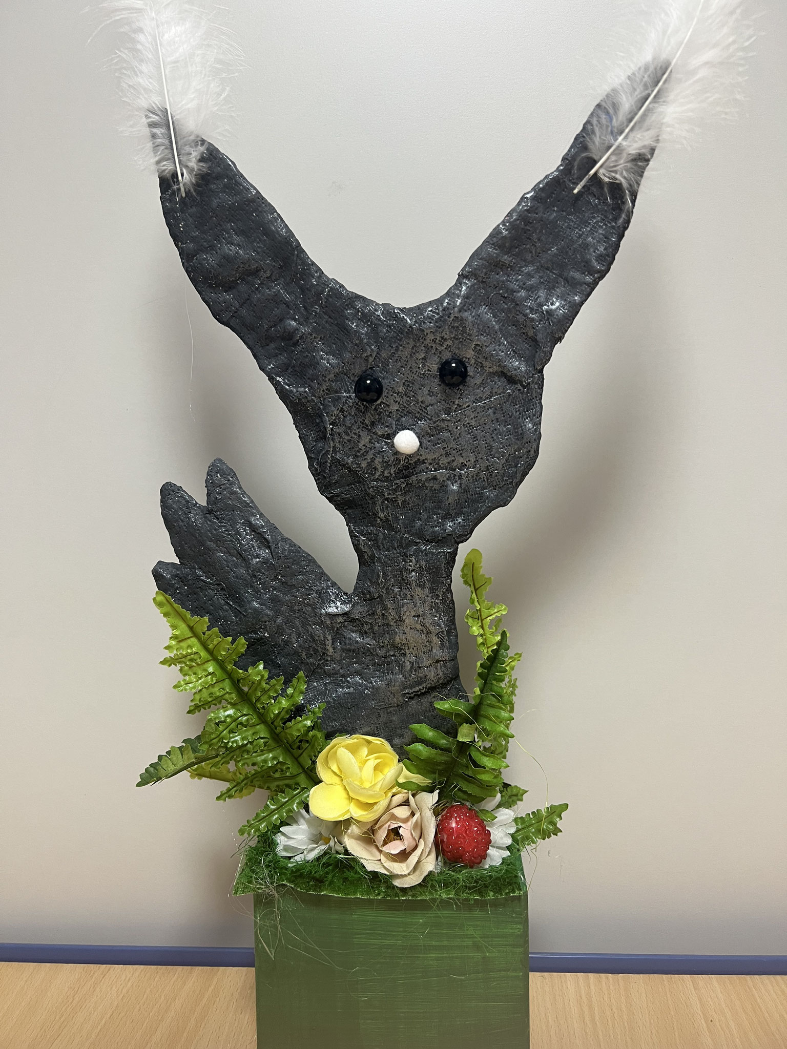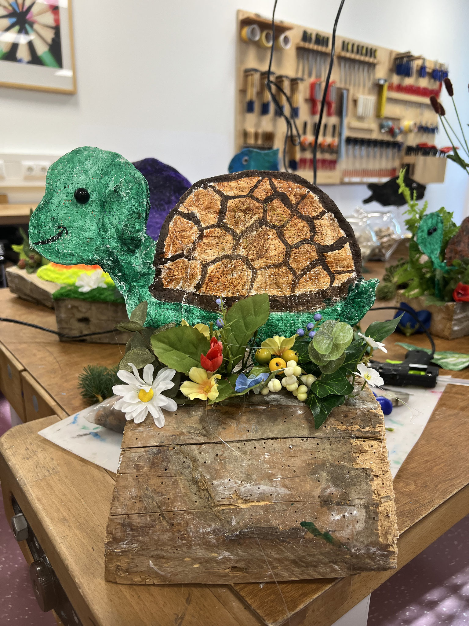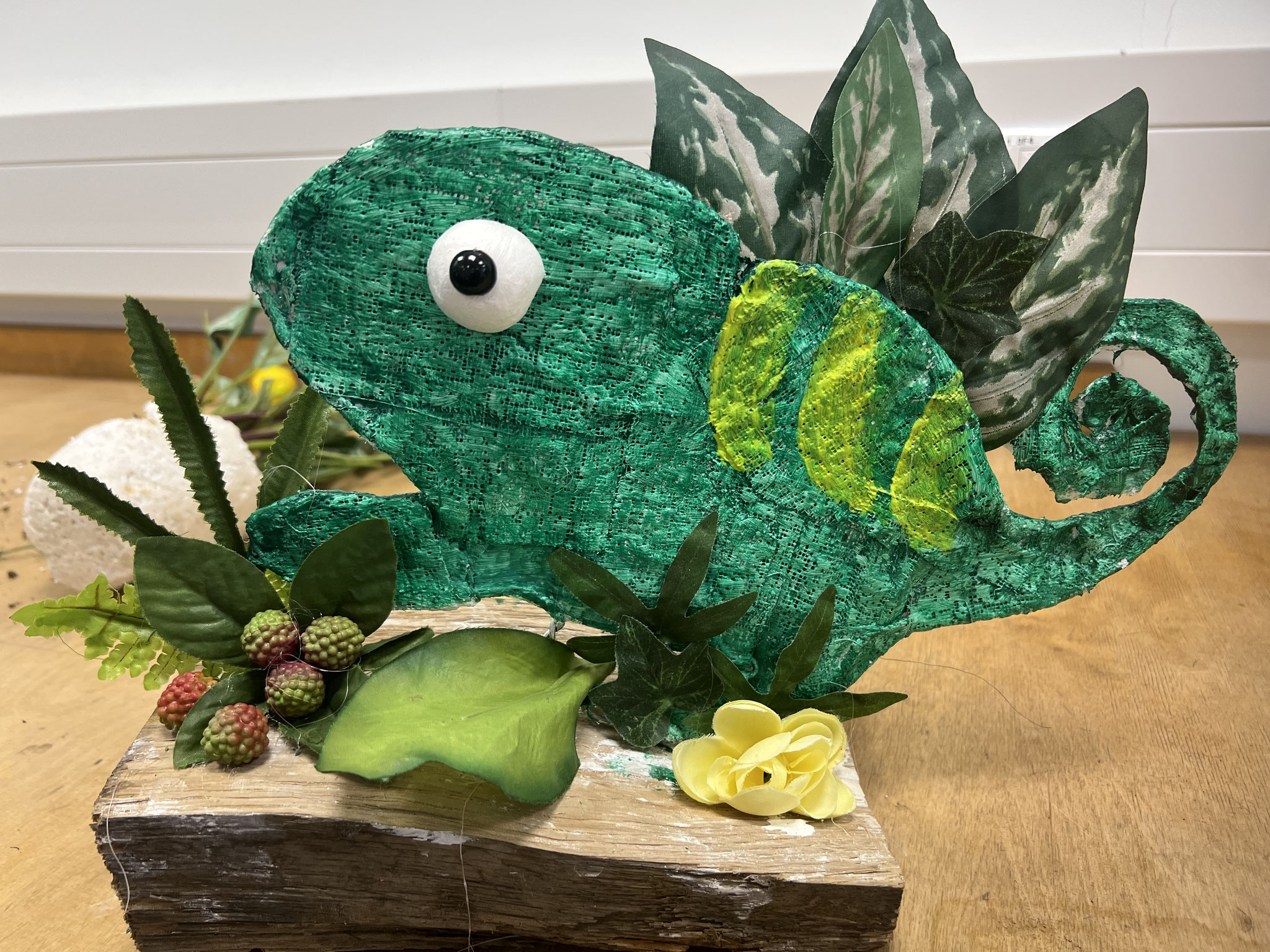 Nachdem sich zunächst die Lehrkräfte im Rahmen einer SCHILF an die Gestaltung heimische Tiere wagten, haben nun auch die vierten Klassen aus Draht, Gips und Acrylfarbe wundervolle Tiere und Fantasiewesen erschaffen. Angeleitet wurden die hierbei von Frau Bollenhagen. Mit Holzklötzen und Plastikblumen entstanden liebevolle Arrangements.